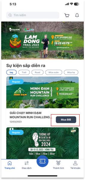 Bước 1: Tại màn hình tab [Homepage] chọn [Mua BIB] để tiến hành mua vé