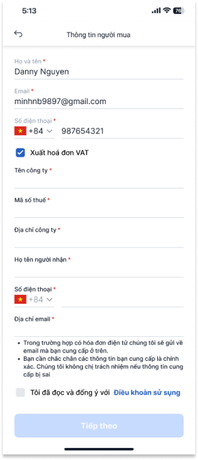 Bước 5: Điền thông tin người mua, tích vào ô [Tôi đã đọc và đồng ý với các điều khoản sử sử dụng]