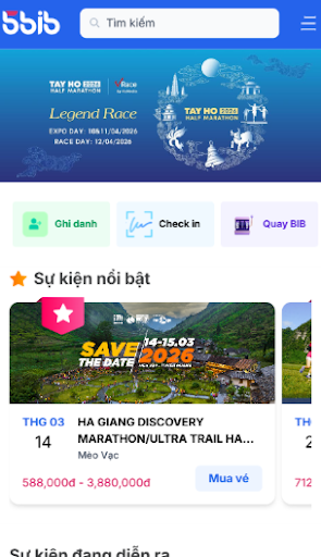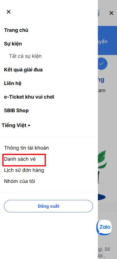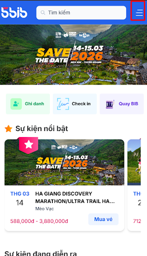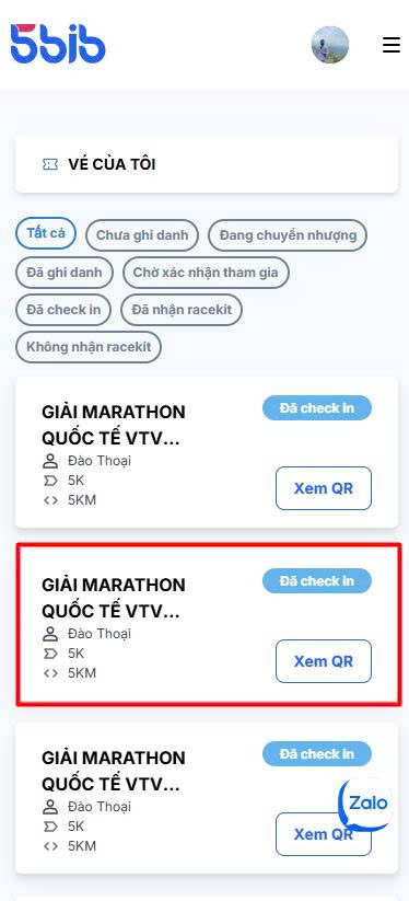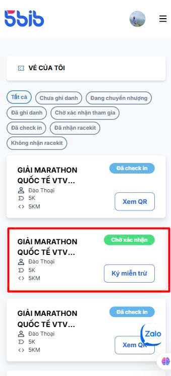 Thay đổi Cự Ly Trên web và trên app 5bib Thay đổi cự ly trên web 5bib.com Bước 1: Truy cập website 5bib.com Bước 2: Sau khi đăng nhập vào trang 5bib.com bấm vào [vé của tôi] bên tr