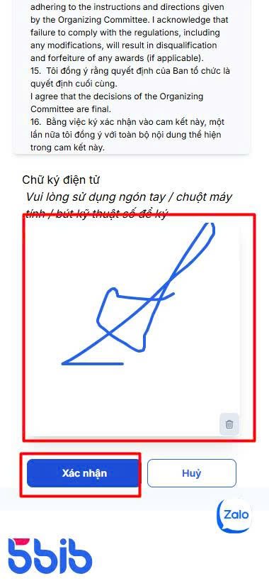 Bước 4: Đọc kỹ điều khoản trong cam kết và vuốt lên trên, sử dụng chuột/ngón tay/bút cảm ứng để ký, sau đó chọn [xác nhận] để hoàn thành